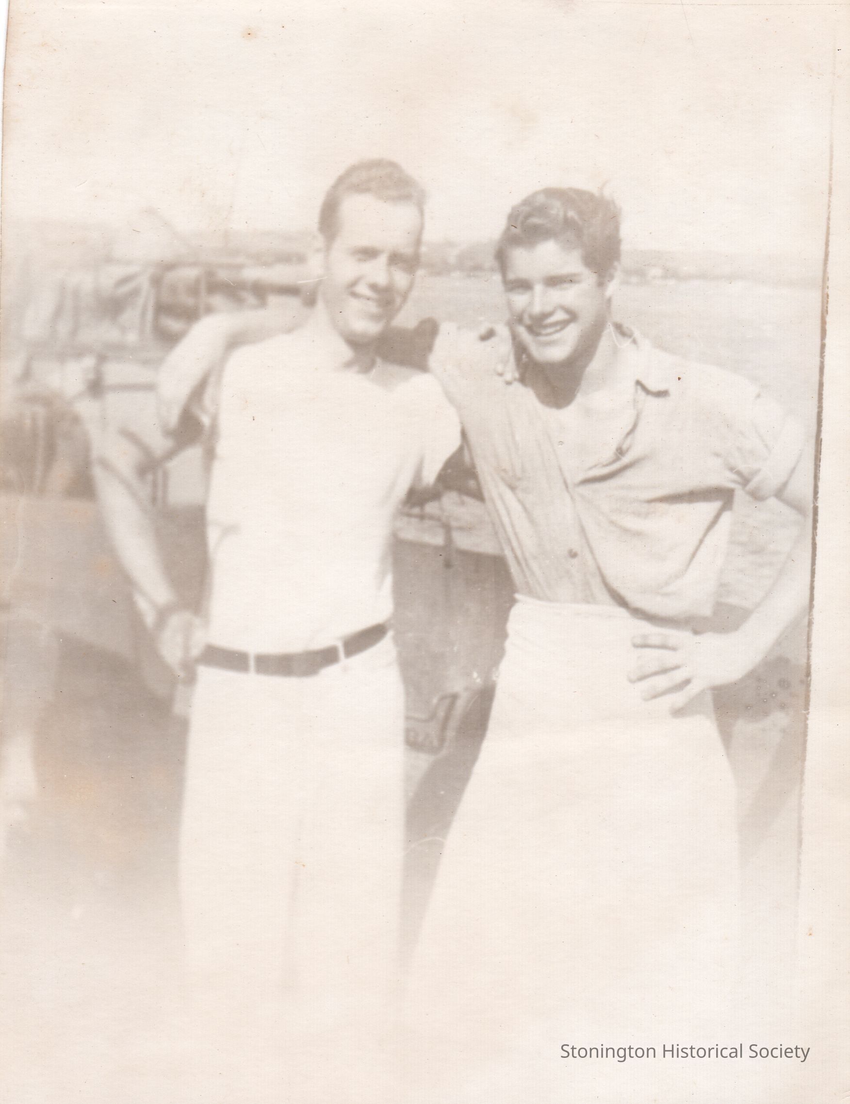 Black and white snapshot from the photograph collection of Frederick Eugene Weeks. Handwritten on back: "- ENGINEERS, "BLACK GANG"." Weeks was born in Stonington on March 16, 1922 and served with the U.S. Navy in the Pacific Theater during WWII.