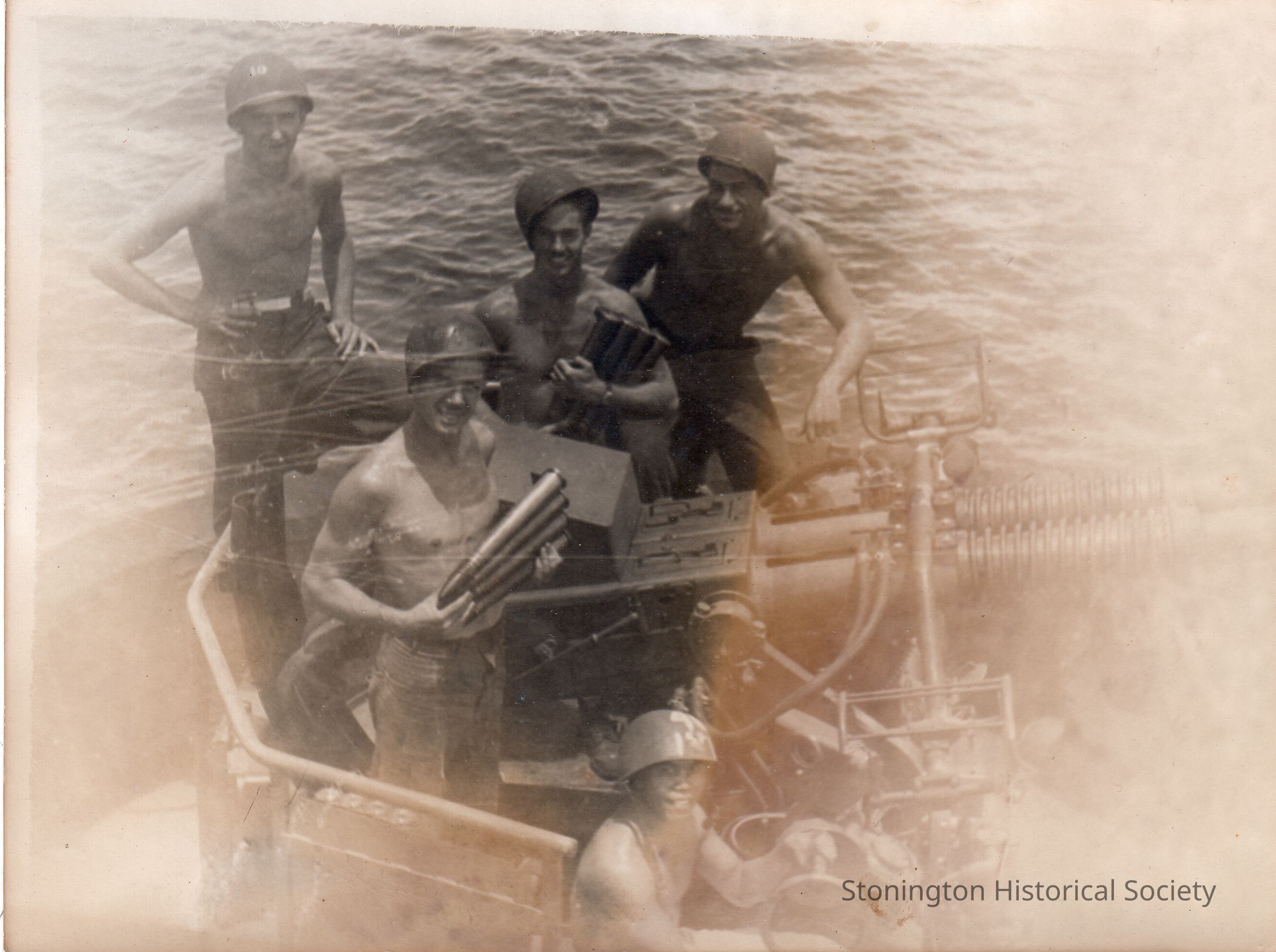 Black and white snapshot from the photograph collection of Frederick Eugene Weeks. Handwritten on back: "- 40 MM & CREW, DARN NICE BUNCH OF GUYS." Weeks was born in Stonington on March 16, 1922 and served with the U.S. Navy in the Pacific Theater during WWII.