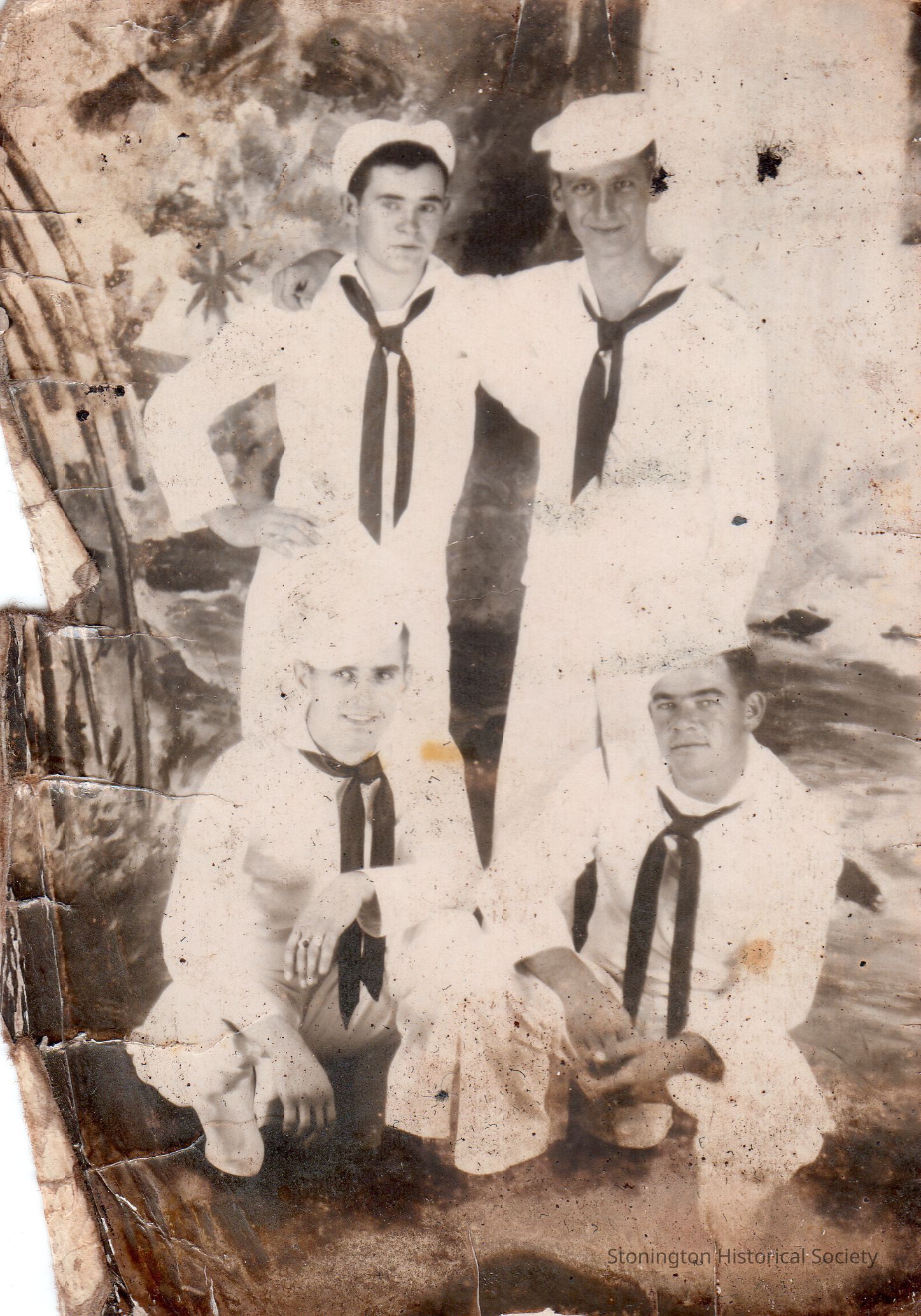 Photograph of 4 sailors, Fred E. Weeks is kneeling on the bottom right. Weeks was born in Stonington on March 16, 1922 and served with the U.S. Navy in the Pacific theater during WWII.