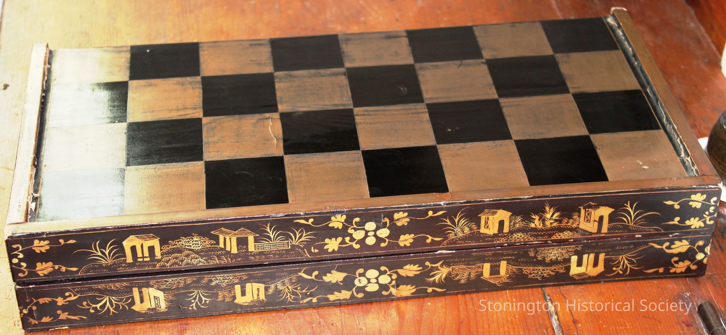 Game. Chinese. Combination checkers and backgammon set, black laquered wood decorated in gold. Checker board on outside with backgammon set inside silk box. Set includes: 15 red checker pieces, 15 black checker pieces, 1 red dice cup, 1 white dice cup and 3 dieCollection