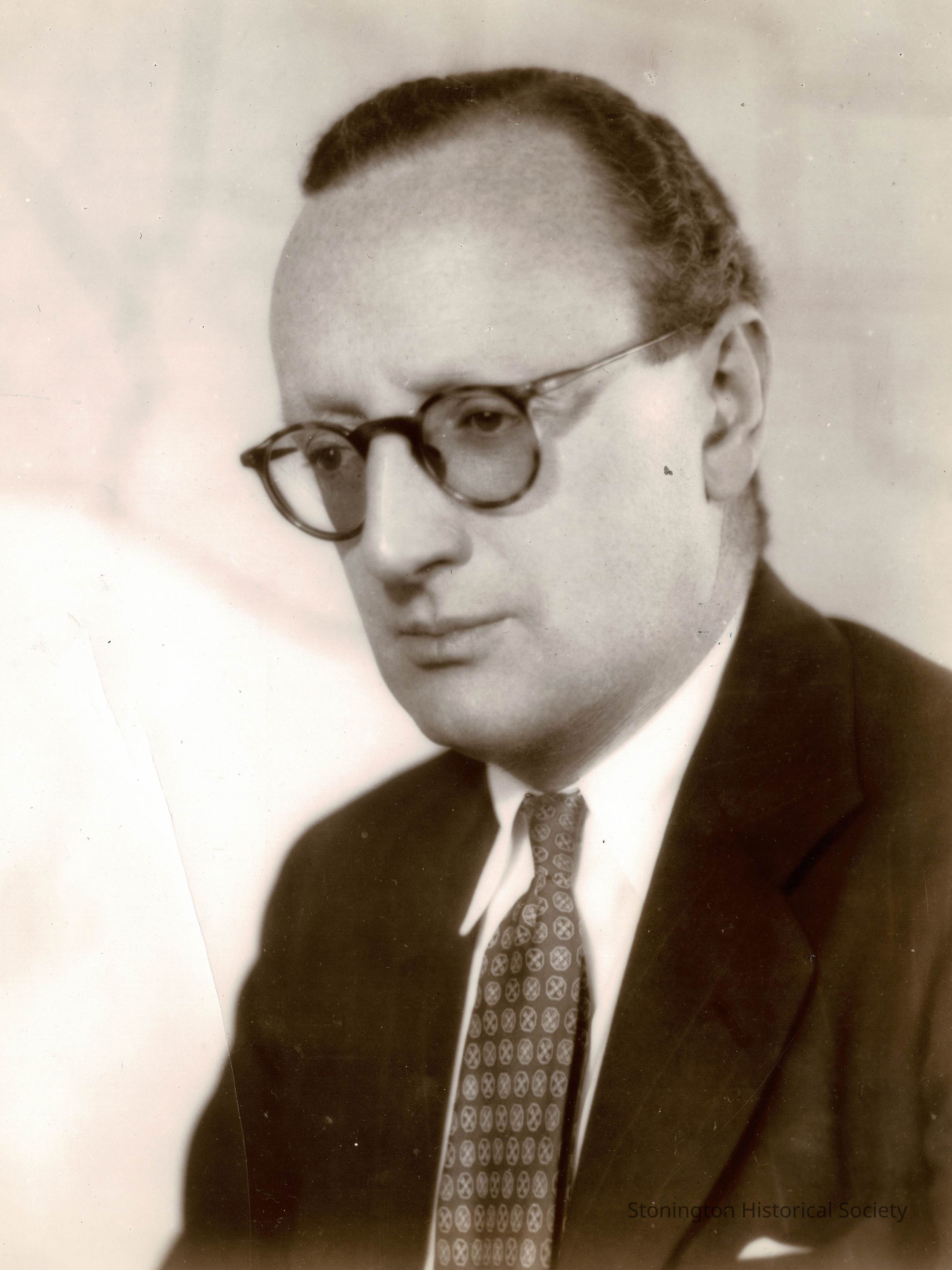 Black and white photograph supplied by the British Information Services, out of New York, of George D'Arcy Edmondson, Controller of the British Information Services, and a speaker at the opening ceremonies of the Stonington Tricentennial on August 6, 1949. At the opening services, he read a message from His Britannic Majesty's Ambassador. It appears at the time that Edmondson was working at the British embassy. Later, from1959 to 1962, he served as the Consul-General in Boston.Collection