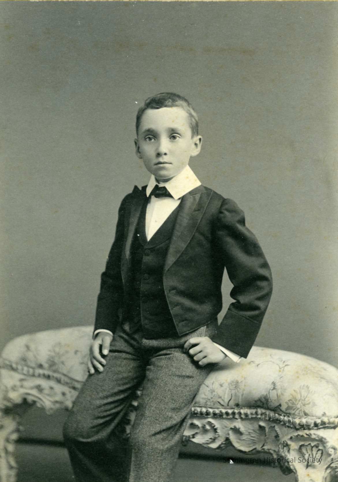 In this photograph he is about ten years old, and is seated on a small, light colored ottoman. He is wearing grey wool pants, a short jacket, vest, collar and cravat.Collection