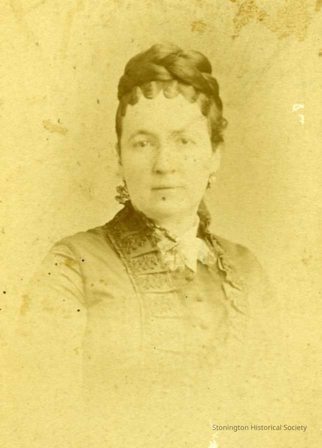A small portrait photograph of Georgia Palmer Babcock(1837-1910), the wife of Charles P. Williams Sr. In this photograph she is wearing a dark colored dress with a lace neckerchief. Her hair is in scalloped pin curls around her forehead.Collection