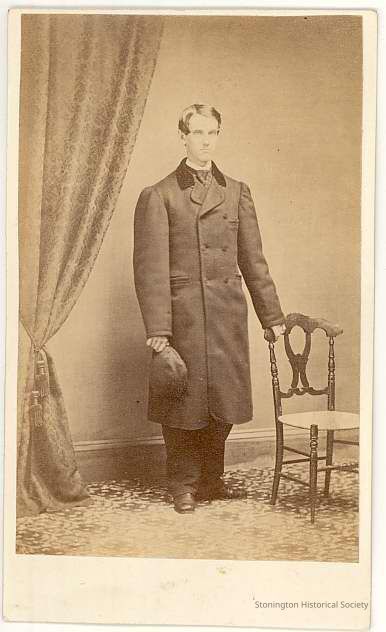 Full, standing portrait of unidentified young man in overcoat holding cap; delicate side chair on right side of photoCollection