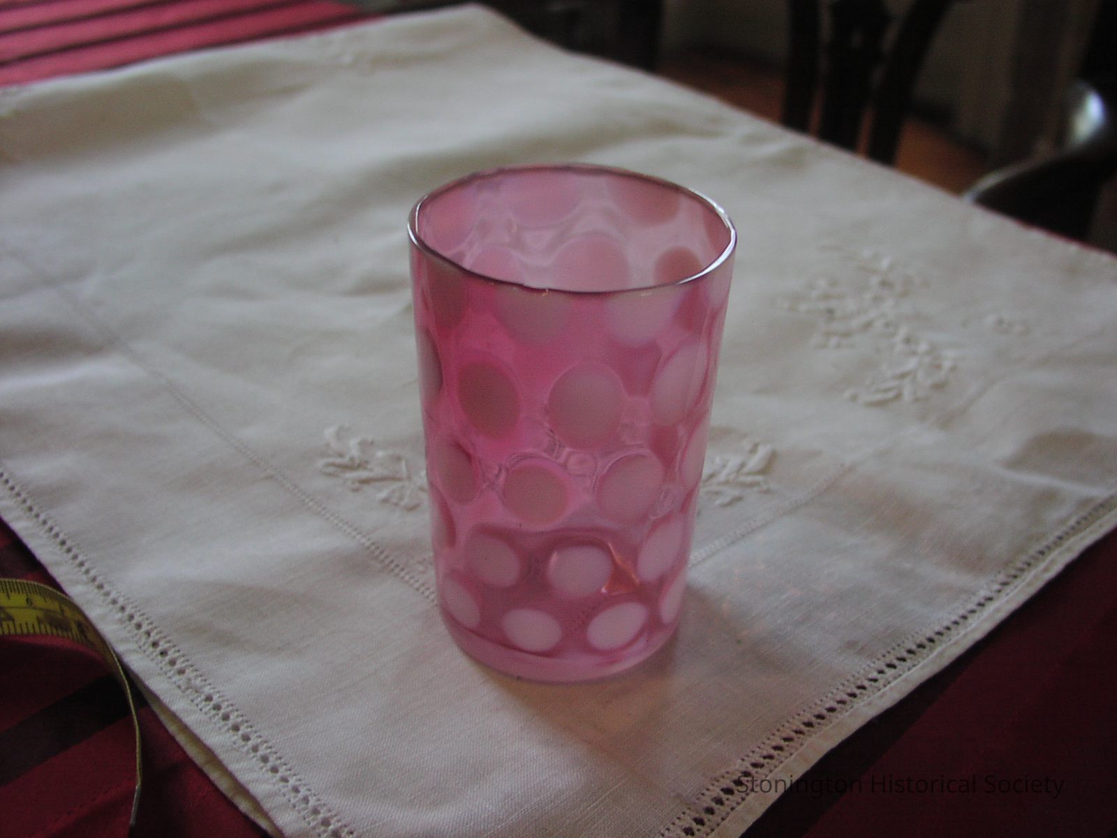One of five; blown?, simple tumbler shape; cranberry -pink color with 4 or 5 rowsof white spots - "coin print"