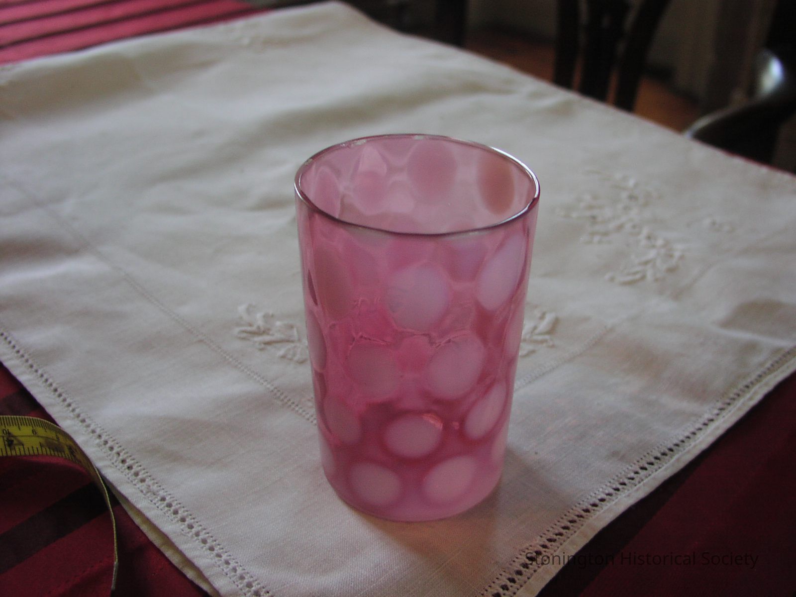 One of five; blown?, simple tumbler shape; cranberry -pink color with 4 or 5 rowsof white spots - "coin print"