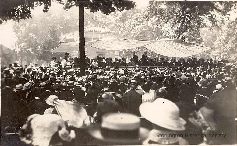 People gathered to hear Gov. Simeon Baldwin speak at Wadawanuck Square during Celebration of the Battle of Stonington, 1914. Notes included