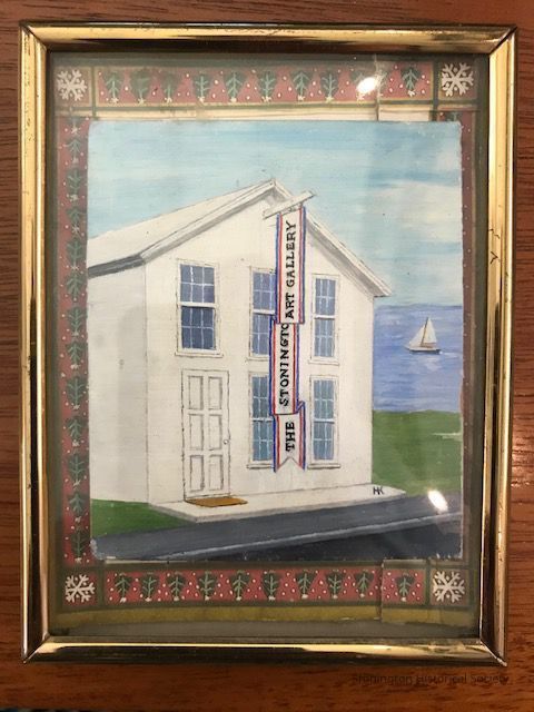 A small framed painting of The Stonington Art Gallery on Grand Street in Stonington Borough. The painting measures approximately 2.5 x 3 inches. No surrounding buildings are pictured, but the water and a small sailboat are visible in the right background.Collection