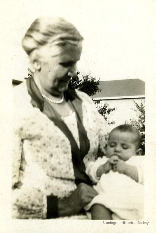 A very small black and white photograph of Jennie D. Wilcox Clark (Grandma Clark) holding her new granddaughter, Carolyn. Back of the photograph reads "Grandma Clark and Carolyn, taken July 1, 1930. 3 1/2 months old."Collection