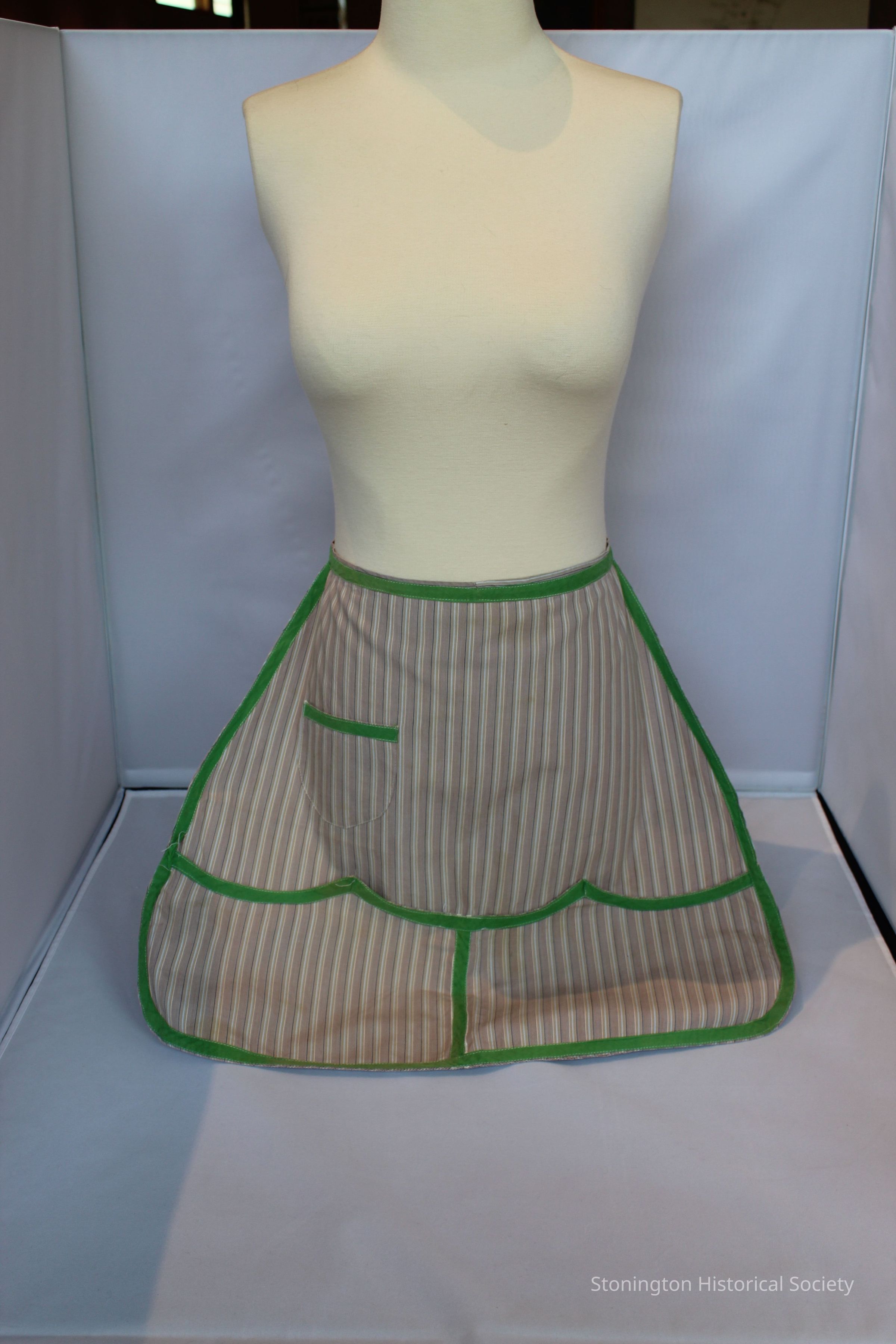 Striped waist apron with green edging and two large pockets on the front, as well as a smaller, decorative pocket on the right side. Probably a gardening apron due to pocket design. Made by Jerusha Anne Tucker Coon Woods in the early 20th century. Jerusha worked as a tailor, and also operated Birchwood Dairy on South Broad Street in Pawcatuck with her husband, Eugene M. Woods.Collection