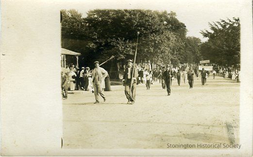 Group of men with various poles, one looks like a long fishing spear or a harpoon.
