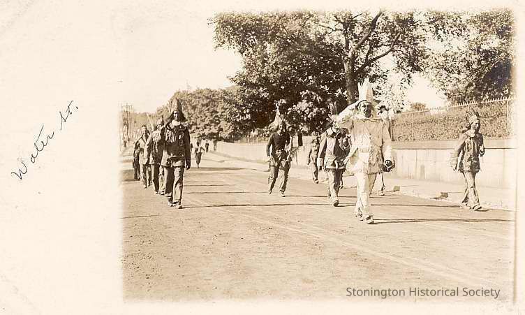 Group of Pequot Warriors by Red Men of New London marching in parade for Battle of Stonington Celebration, 1914 going south on Water Street