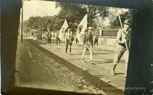 Group with assorted flags portraying American minute men. Chain link fence on one side. This is on Water Street entering the borough going towards the Point next to the Loper mansion which later became the Post Office site.
