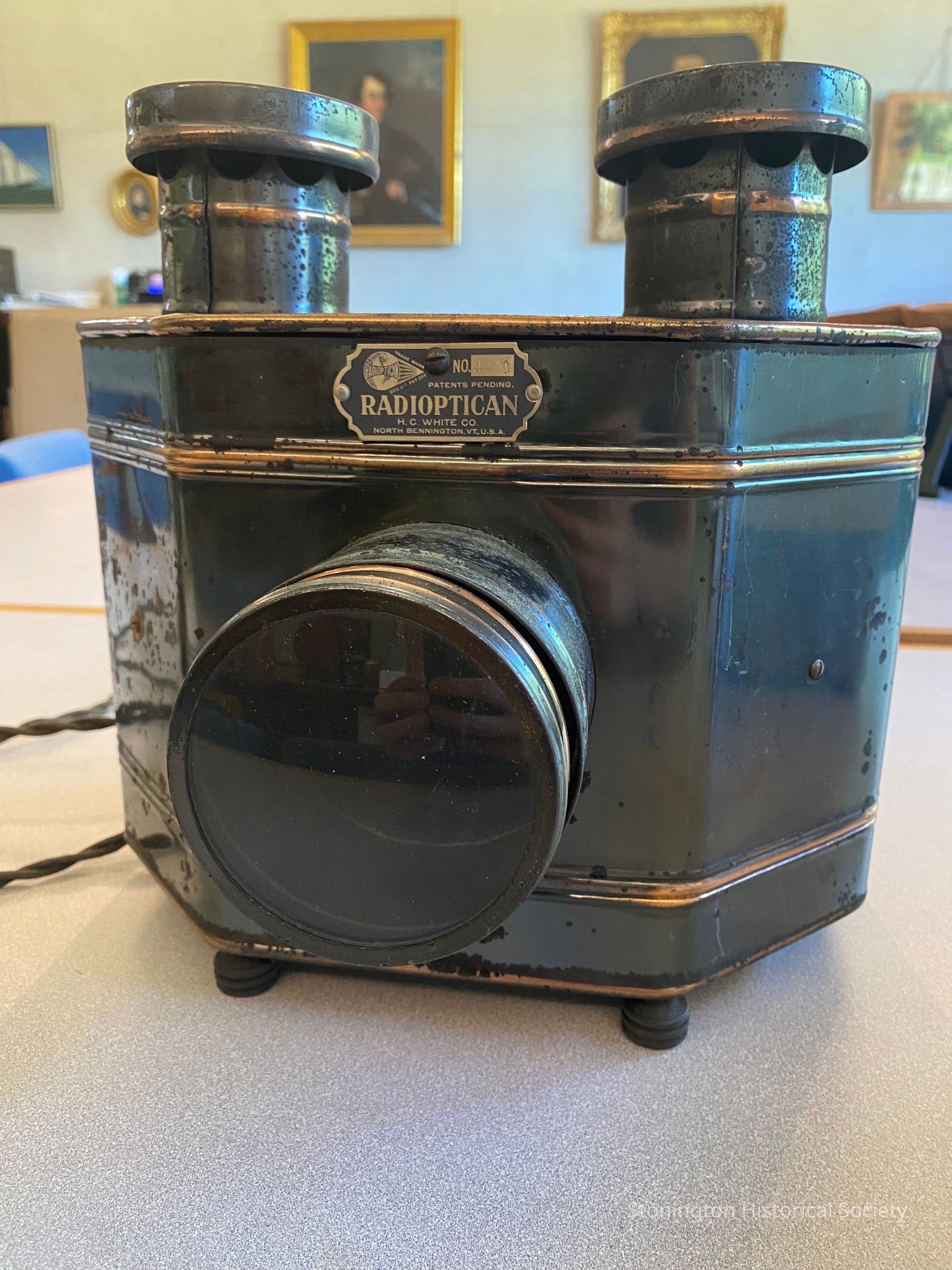 Metal postcard projector, most likely made between 1900 and 1910 by the H.C. White Company of Bennington, Vermont. Radioptician with user's manual "Hints for Home Entertainment". Includes two sliding doors. Bulbs have been replaced with lower wattage to fit with manufacturer's recommendations. Electric plug still works (as of 2025). Used for projecting postcards or photographs.