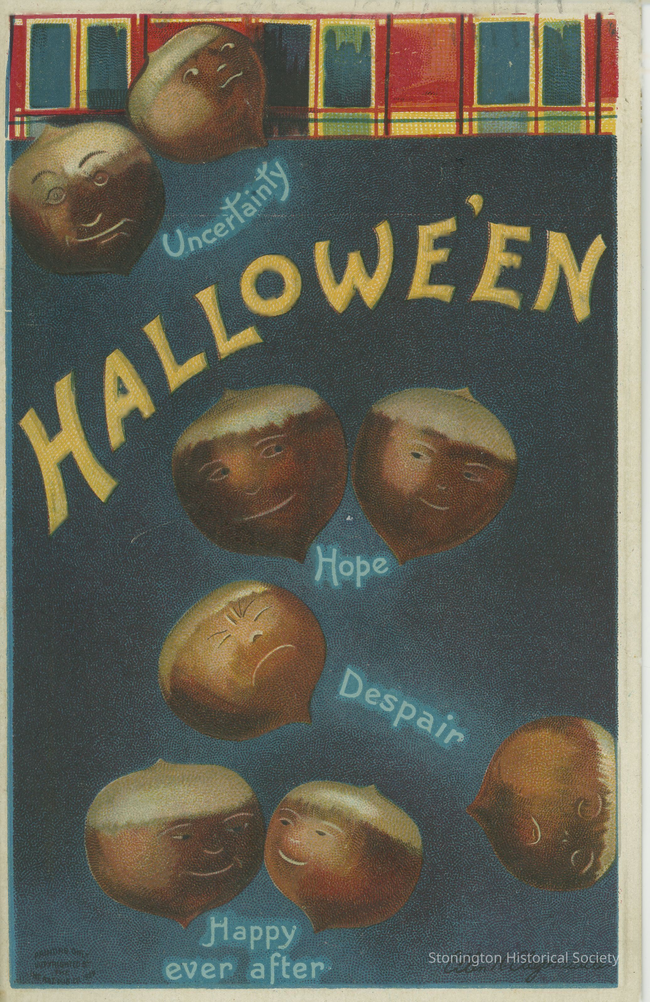 Holiday postcard for Halloween with acorns showing different emotions. 6 3/8 x 4 3/8 inches.