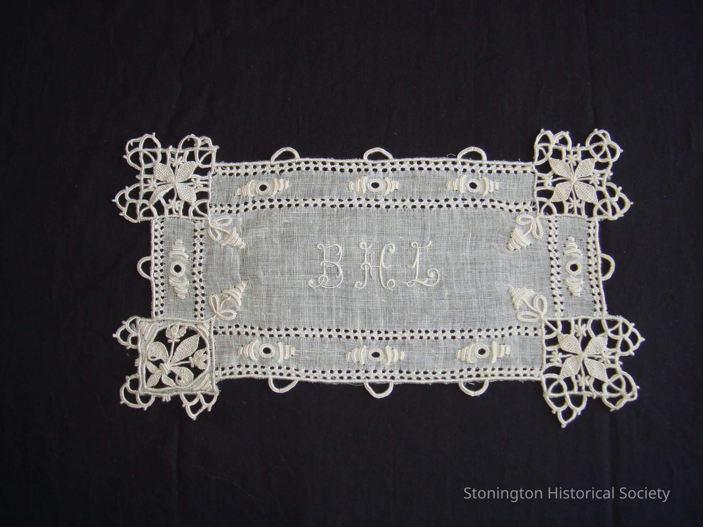 a- cream colored linen batiste with crochet corners, 3 floral and one fleur de lys