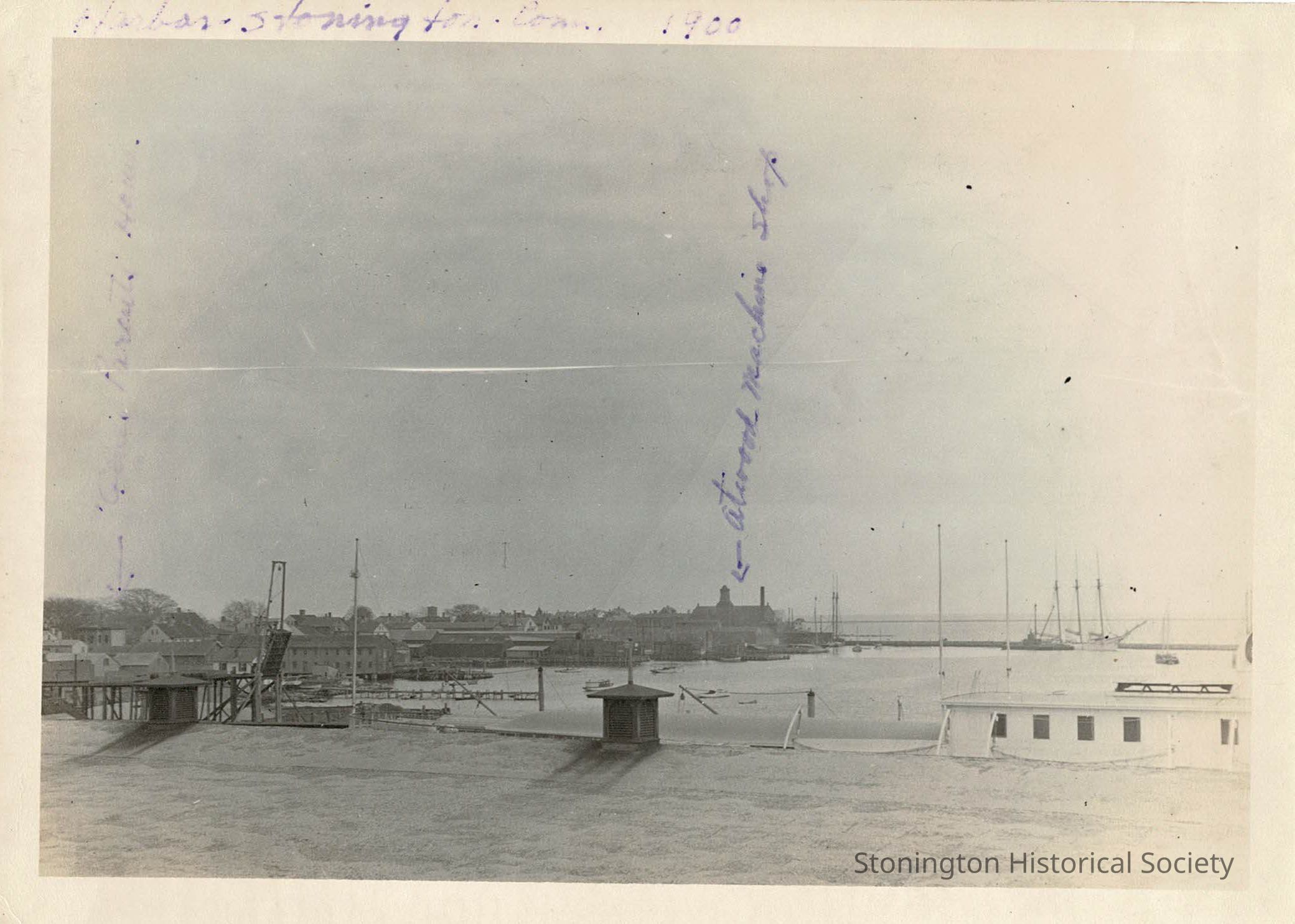 Harbor - Stonington, CT 1900 "Geri's Parents Home" written on image with arrow "Atwood Machine Shop" also shown with arrow