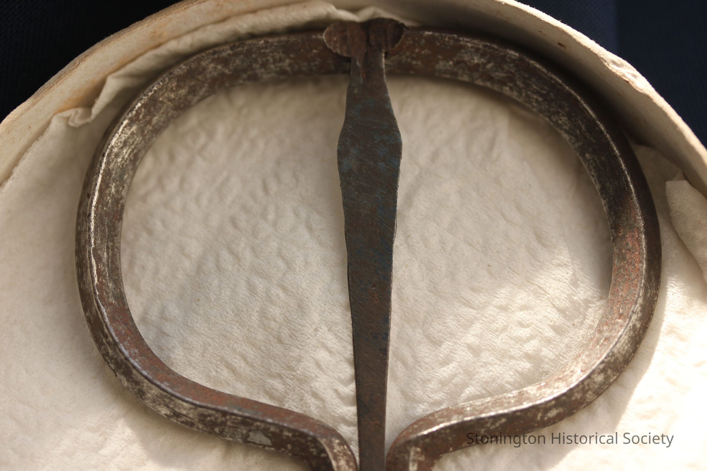 This Jaw or Jew's harp is comprised of two pieces of metal--one curves around at the bottom and is straight on top while a second piece of metal bisects the middle. It rests in a circular white box with blue, pink and purple flowers on the lid.