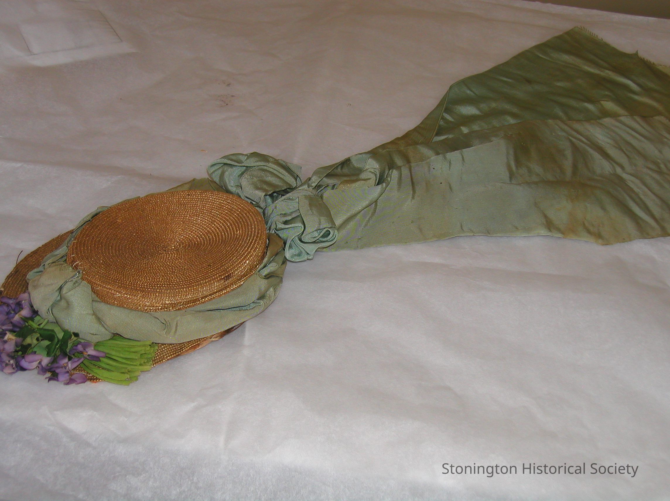 wide light green ribbon around rim streaming down back