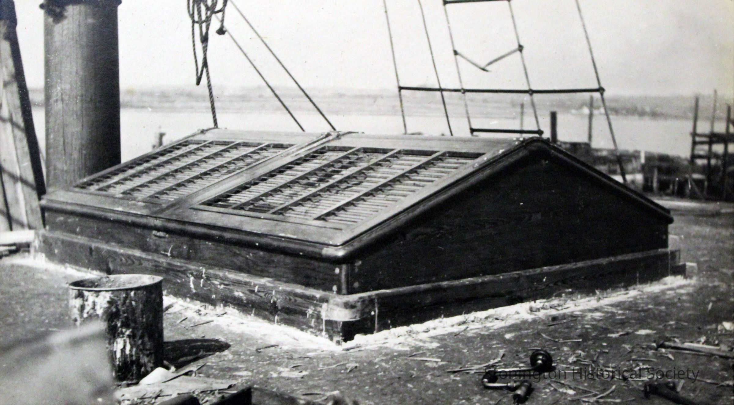 Hatch on the deck of the SS Lansing. A nearby bucket and the white muddy texture around its base may indicate putty or caulking of some kind to waterproof the seams. The Lansing steamship was rebuilt by the Ship Construction and Trading Company, Inc. of Stonington for the Nafra Company of New York.Made/Created