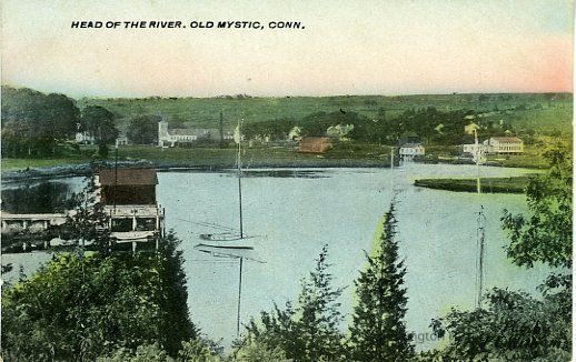 Head of the River at Old Mystic, CT with view of water and buildings Color photo Former accession no. 1999.001.0244