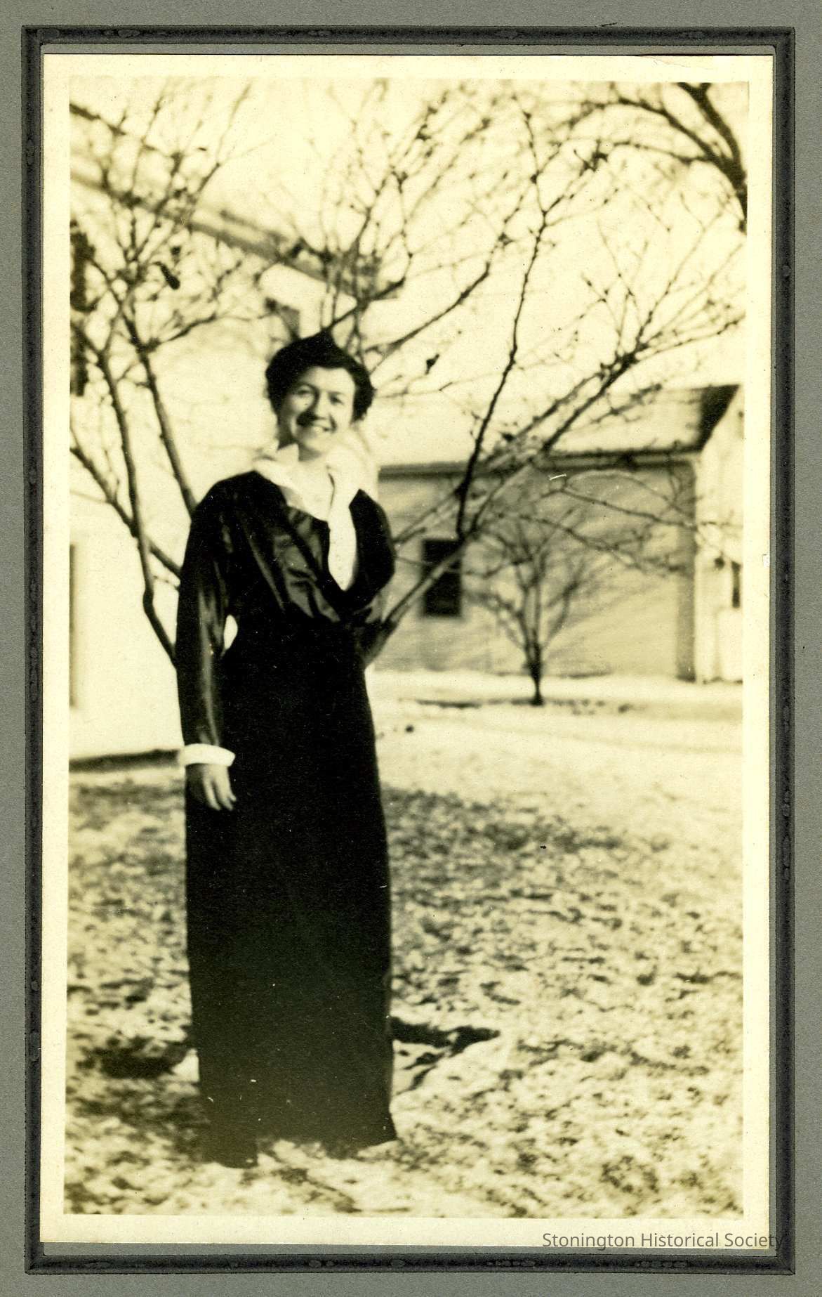 A portrait photograph of Helen M. Koelb. She is standing in front of a small tree in a snowy yard, smiling at the camera. Reverse of photograph reads "Helen Koelb at her home, Elm. St., Stonington."