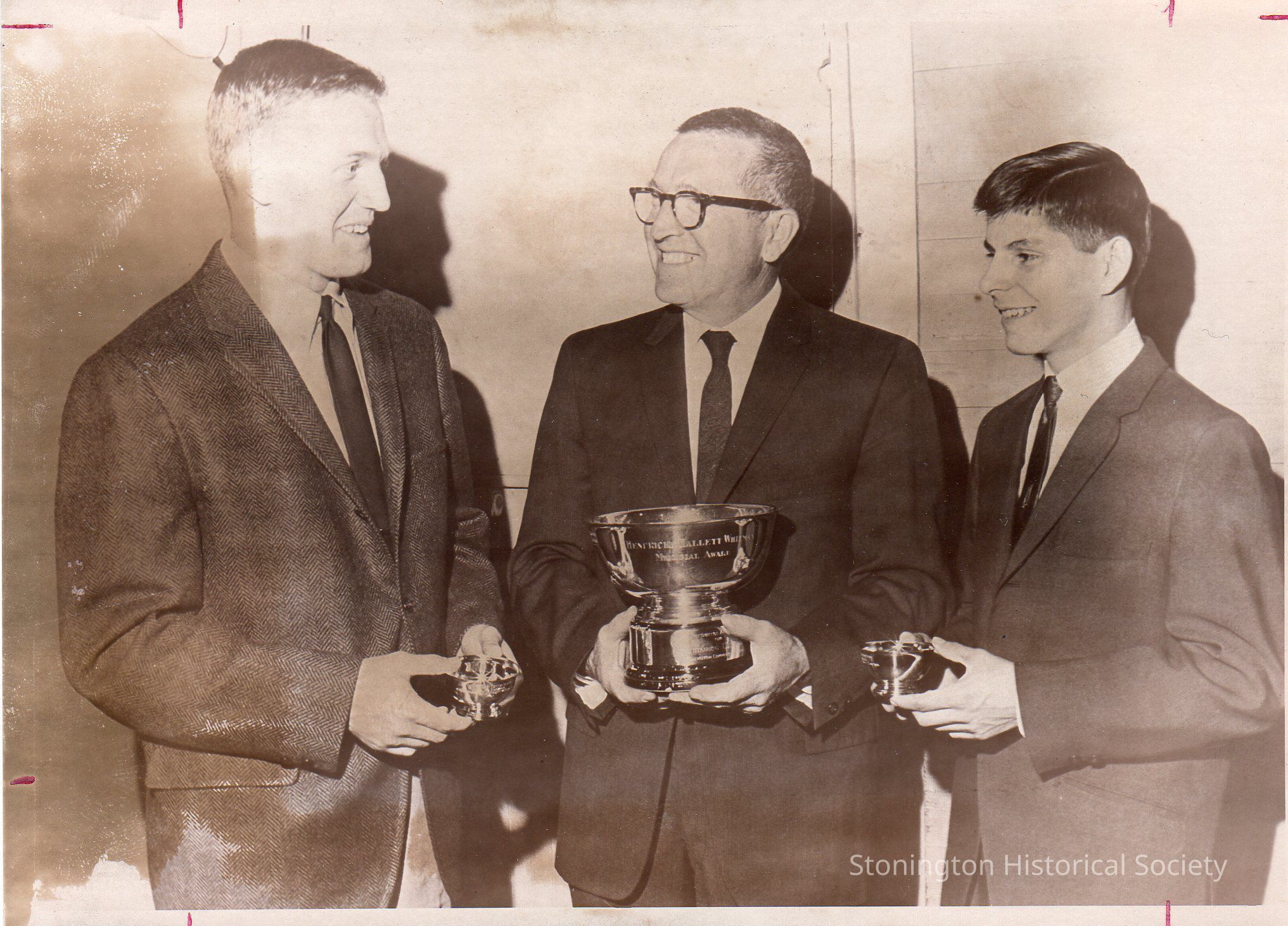 Black and white photograph of Douglas Erskine (left), Frank Turek (center) and Allan Teixiera (right) at the Hendricks H. Whitman memorial awards ceremony at the Stonington Community Center, May 1965. In envelope with negative and news clipping.