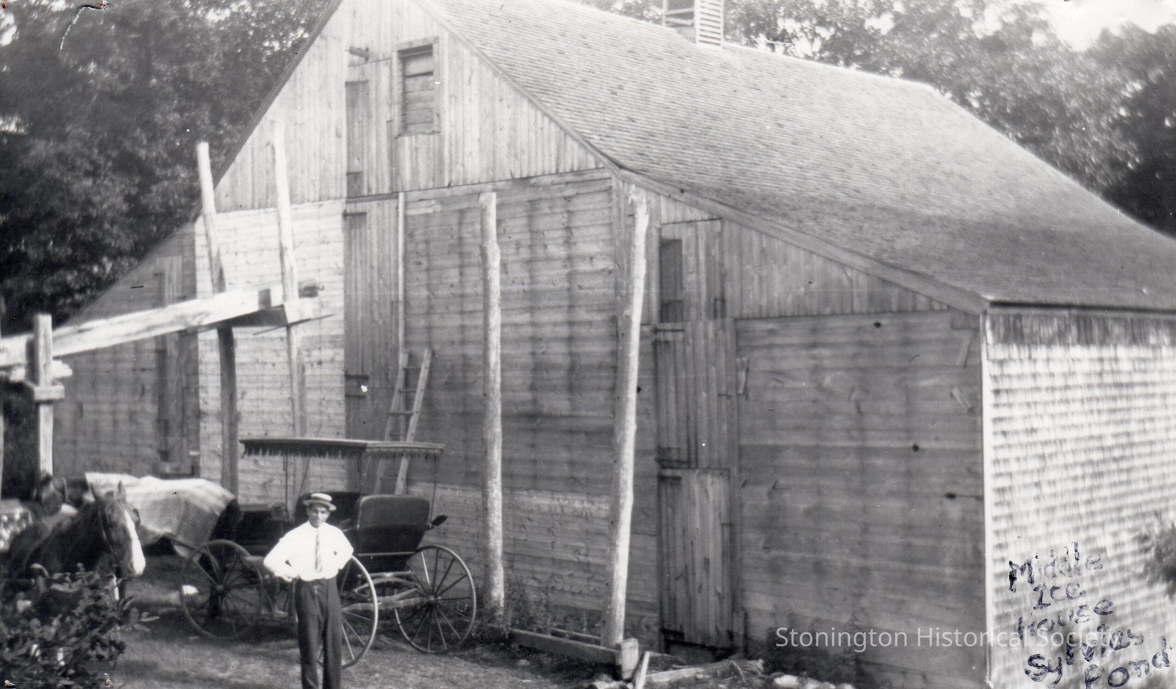 3 photographs and 1 photocopy, images of the ice harvesting business in Stonington in the early 1900s. Photocopy shows "Ice Man" Joe Mendonca on Oak Street in Stonington, c. 1925.Collection