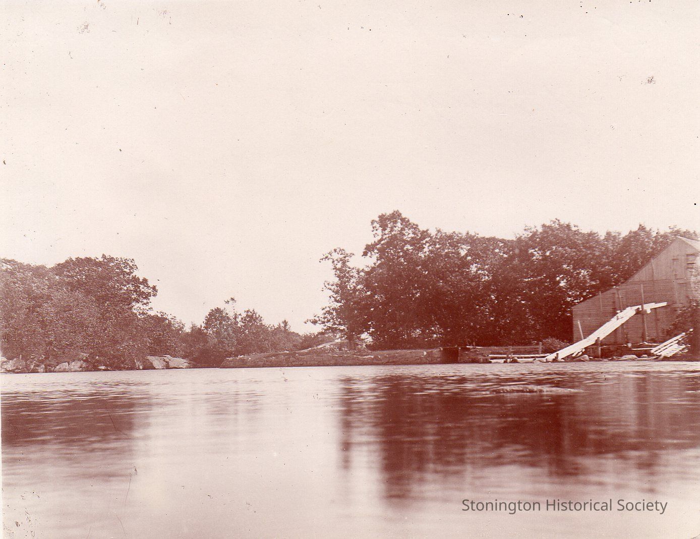 Black and white photograph of Sylvia's Pond in Stonington, with the Ice House visible on the right.