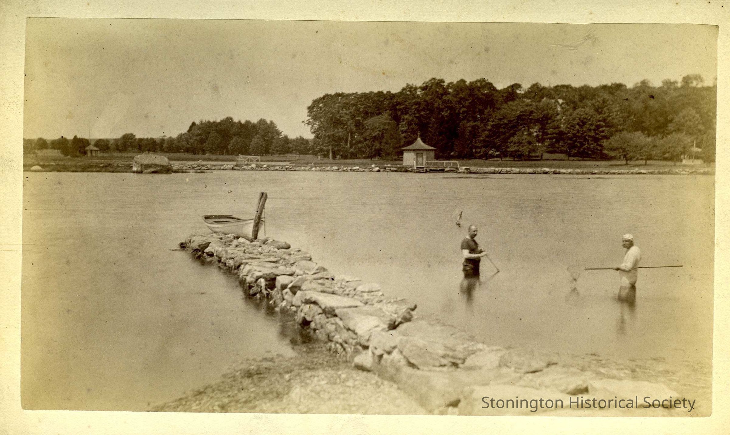 A photograph of two men standing in a cove with nets. A small boat house is visible across the cove at center. One of the men was pictured in .150. Reverse of the picture reads "Cove before Route 1 corssed it in 1938." It is believed to be Quanaduck Cove, as that is the closest to Stone Acres and would have been part of the original property. The men are unfortunately, unidentified.Collection