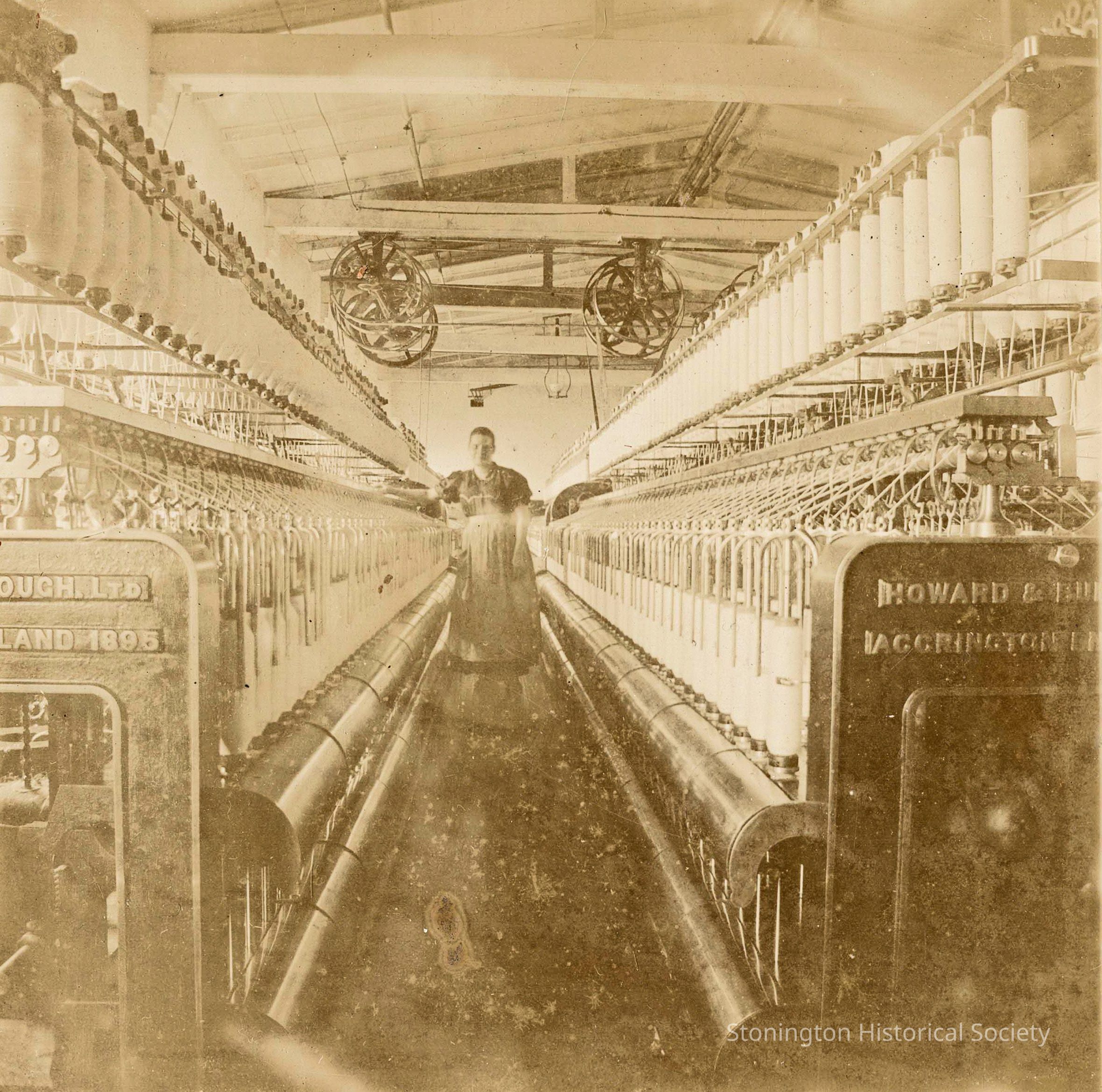 Alice Annie Ratcliffe Crowther (1869-1935) standing on the floor of the Clark Thread Mill in Lower Pawcatuck, around 1900. The machinery was made by Howard & Bullough, LTD of Aggrington, England which specialized in cotton mill machinery.Collection