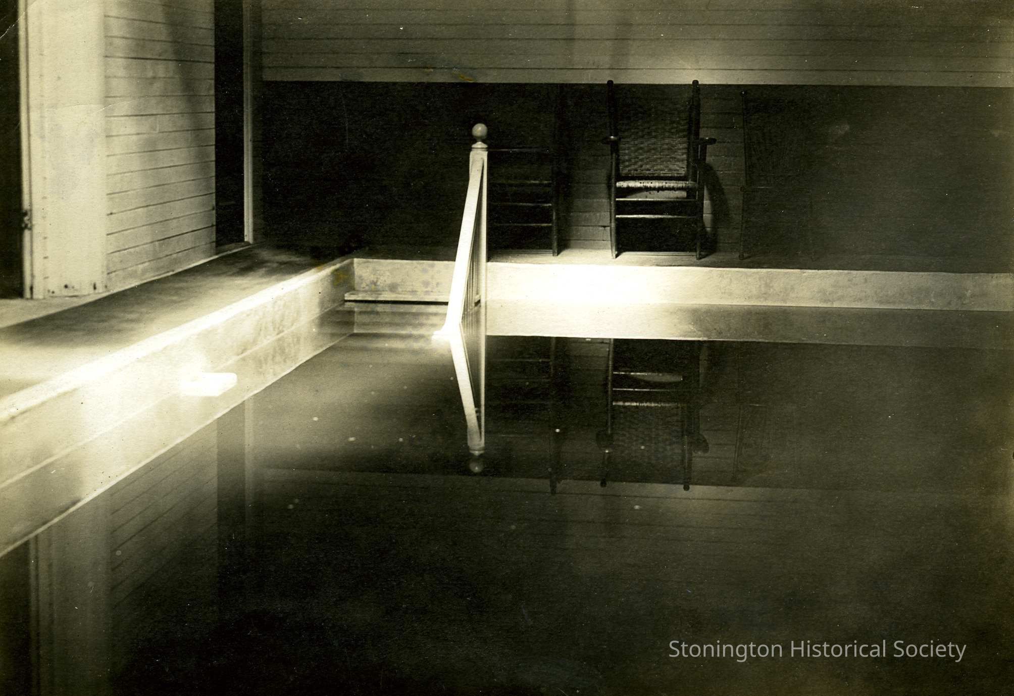 A photograph of the indoor pool at Stone Acres Farm. The only things visible in the picture are a few chairs and the handrailing and stairs leading into the water. The reverse side of the photograph reads "Indoor pool, first building on left". The indoor pool is no longer at Stone Acres.Collection