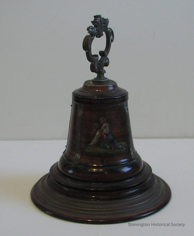 wooden inkstand, bell-shaped and tall with a picture of a little boy riding on an older boy's back. It belonged to Rev. Ira Hart (1771-1829) who was the pastor of the First Congregational Church (109-1829).Collection