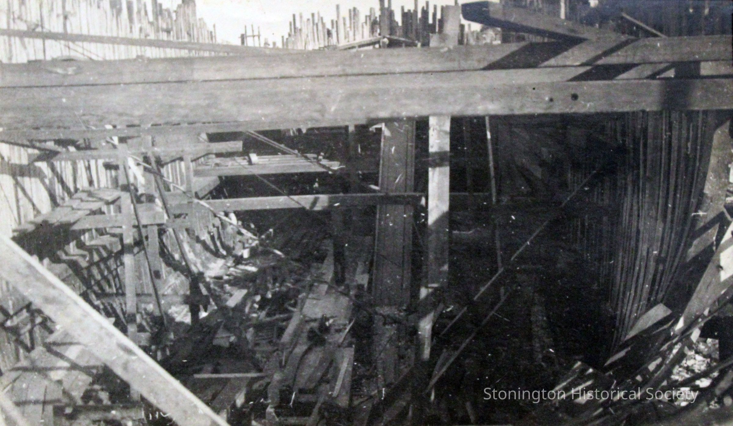 View of the SS Lansing under construction at Stonington dock c.1918. The image shows the hull under construction, and the scaffolding, ladders and braces used to secure the ship as it was worked on. The Lansing steamship was rebuilt by the Ship Construction and Trading Company, Inc. of Stonington for the Nafra Company of New York.Made/Created