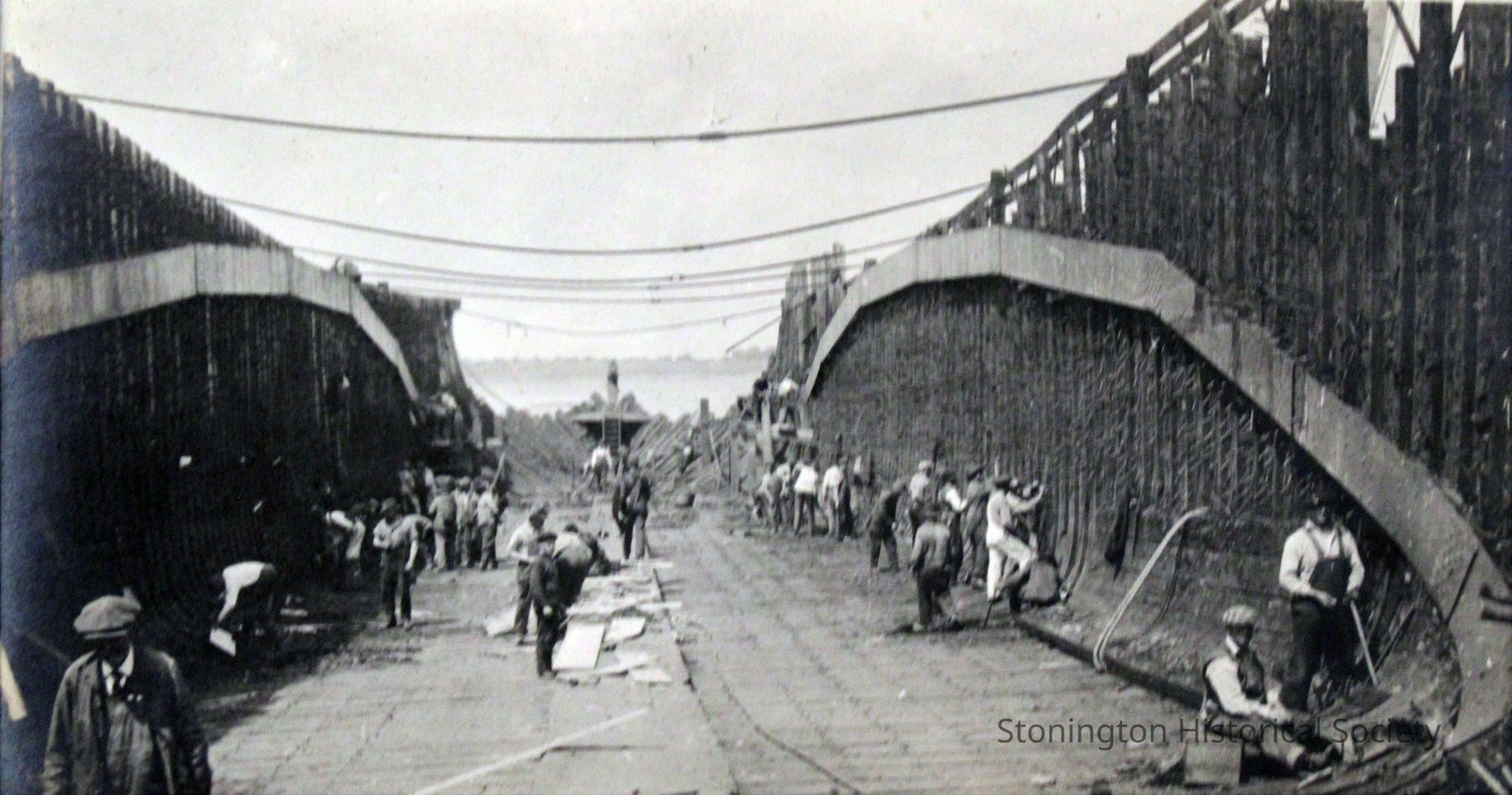 Workers rebuilding The Lansing, 1918 at Stonington docks. Interior scaffolding has been removed, and workers are building the ship's outer hull. Rebuilding by the Ship Construction and Trading Company, Inc. for the Nafra Company.Made/Created