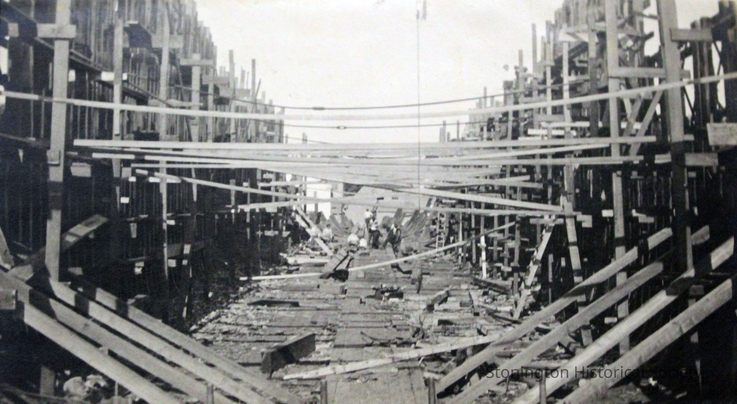 Interior view of the ongoing work on the Lansing at Stonington docks, 1918-1919. Workers are visible in the center background. Scaffolding and support beams are also visible. The Lansing steamship was rebuilt by the Ship Construction and Trading Company, Inc. for the Nafra Company of New York.Made/Created