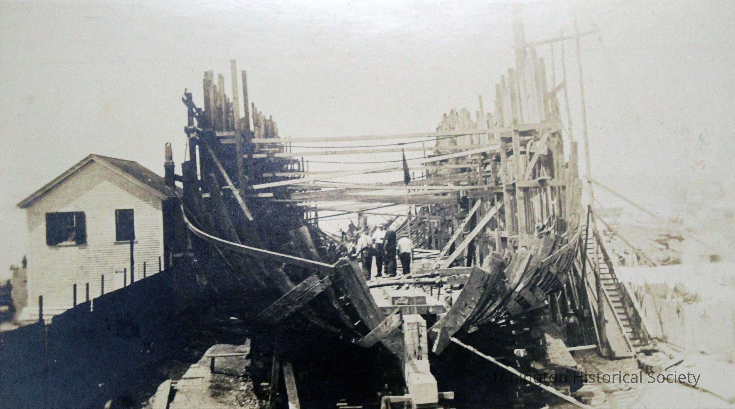 Workers rebuilding The Lansing, 1918 at Stonington docks. Image shows interior scaffolding. Rebuilding by the Ship Construction and Trading Company, Inc. for the Nafra Company.Made/Created