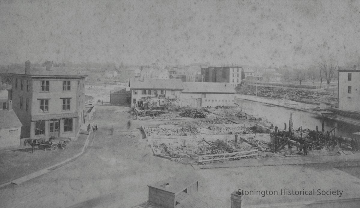 Photograph showing the aftermath of the great flood of 1886 in Pawcatuck Bridge. Image shows the intersection of West Broad and Coggswell Street at the bridge.Made/Created