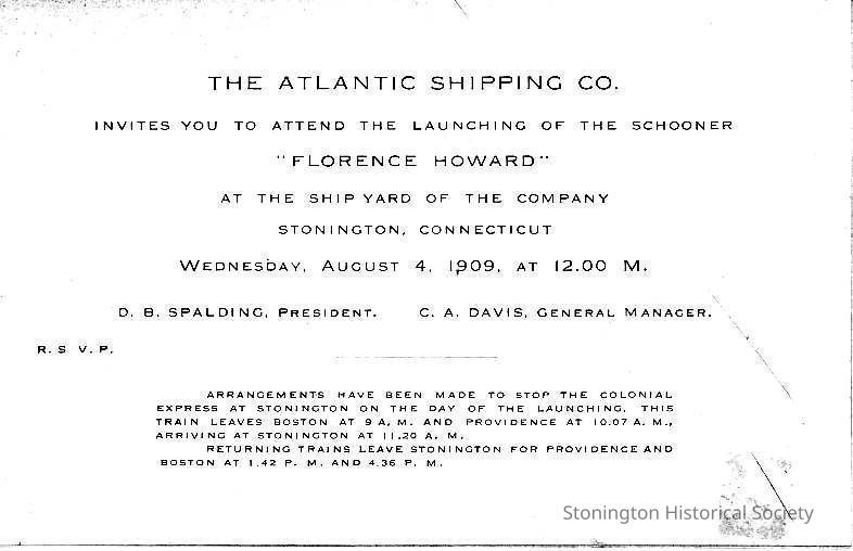 Invitation to the launching of the Florence Howard, Schooner, August 4, 1909