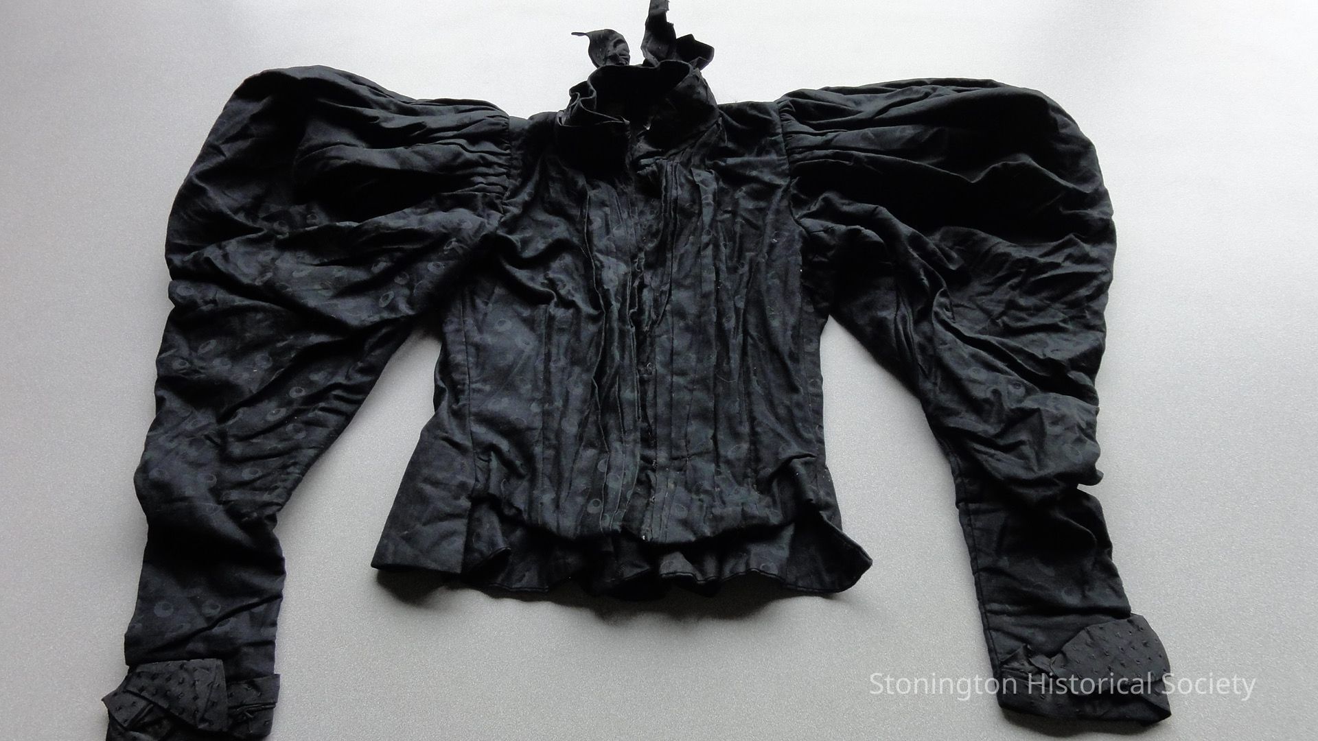 mandarin collar adorned with black taffeta ribbon tied in a bow at back of neck