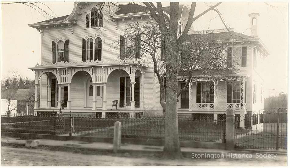 Large white family home in Old Mystic with iron fence and tree in foreground. According to index, this was torn down. It was known as the John Schoonover House.Collection