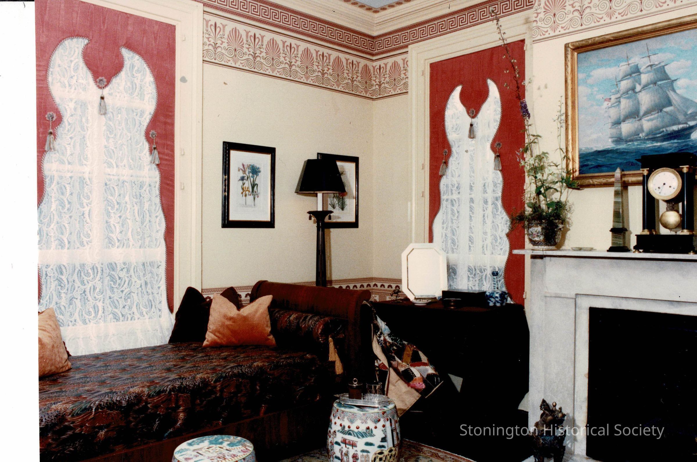 View of “A Lady’s Chamber: Then and Now”, as it was decorated for the Designer’s Show House in 1989. This room was originally used as a bedroom for Captain Alexander S. Palmer’s sons, when the house was finished in 1852. The room was reimagined in 1989 by Michael Black Designs of East Haddam.Collection