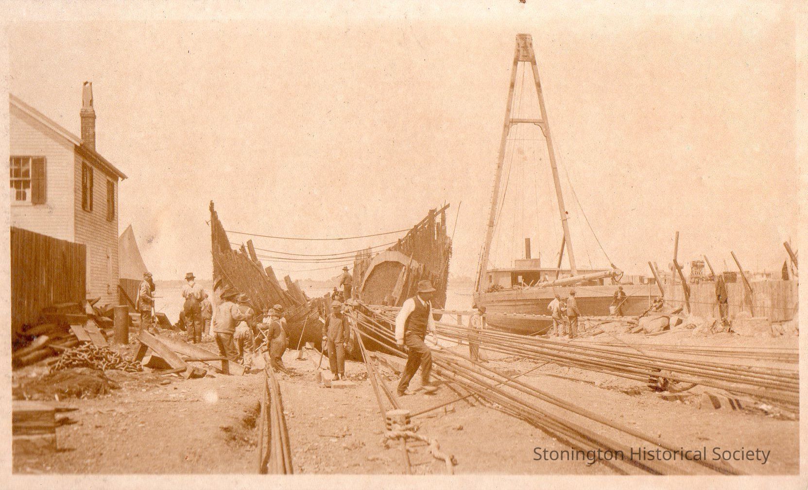 Black photograph album, with black and white snapshots glued to black paper. Photographs show the construction process of re-building the ship LANSING at the Ship Construction & Trading Co., Inc. in Stonington, Conn. over several months in 1918-1919. The LANSING was 30 year old wooden ore carrier owned by the Nafra Co. For additional information see Historic Footnotes Vol. X No. 3.