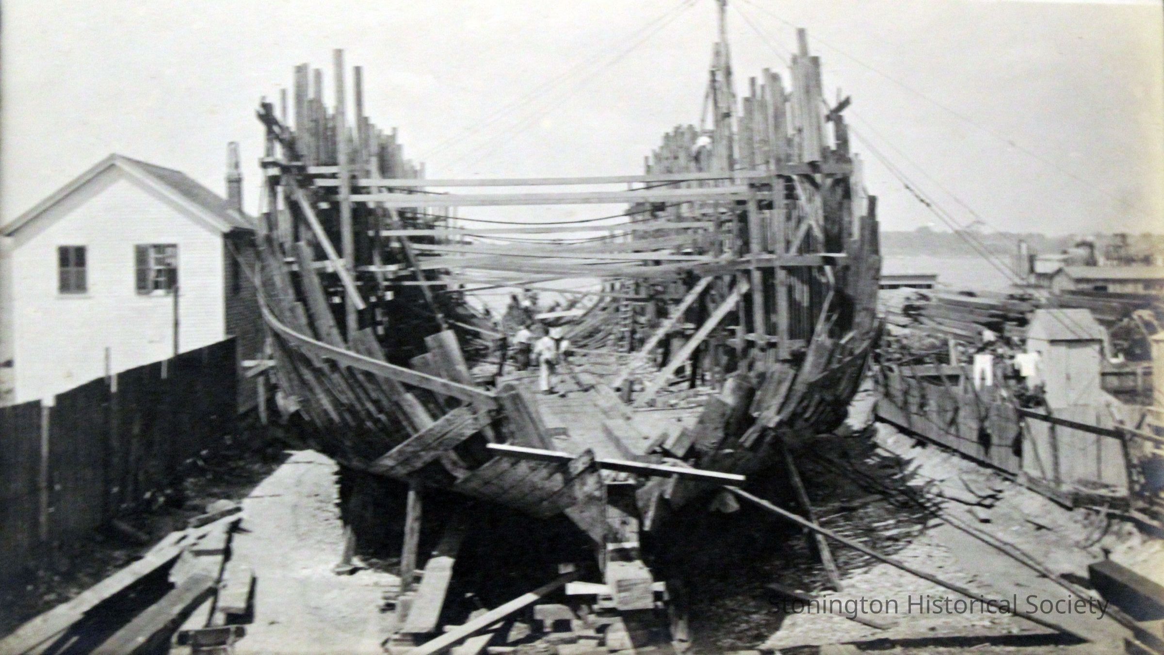 Workers rebuilding The Lansing, 1918 at Stonington docks. Image shows interior scaffolding. Rebuilding by the Ship Construction and Trading Company, Inc. for the Nafra Company.Made/Created