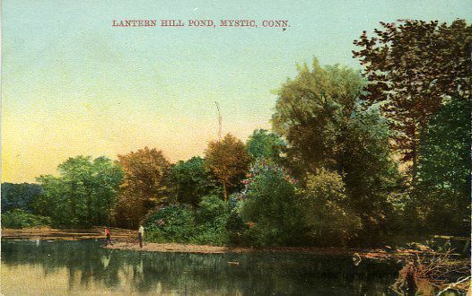 Lantern Hill Pond in Mystic with people fishing Color photo Published by H. D. Utley Former accession no. 1999.001.0240