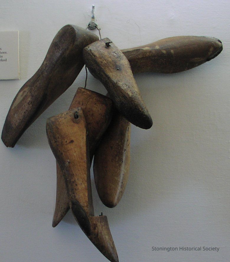 6 cobbler's lasts, wood, different sizes. One marked 'size 4", several marked 'M. Green'. made and used by an early Stonington cobbler.