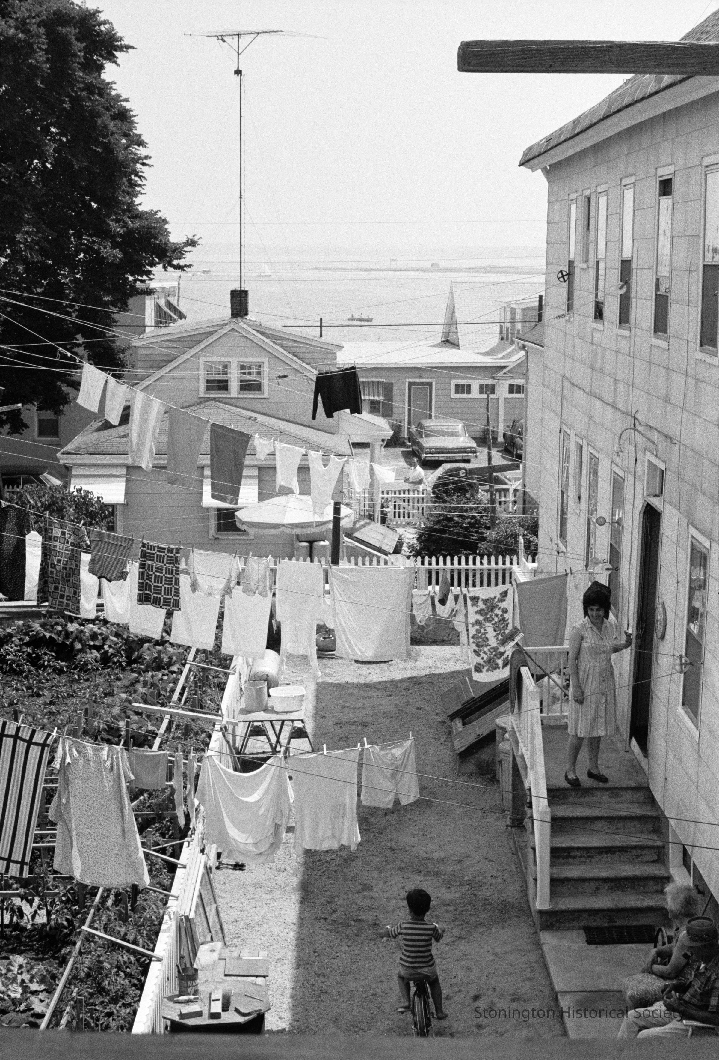 Black and white photograph shows a small boy riding a bike in a backyard on Trumbull St. His mother looks on from the steps, and laundry is hung on the line. Beyond, Sandy Point is visible as is Hancox Street.Collection