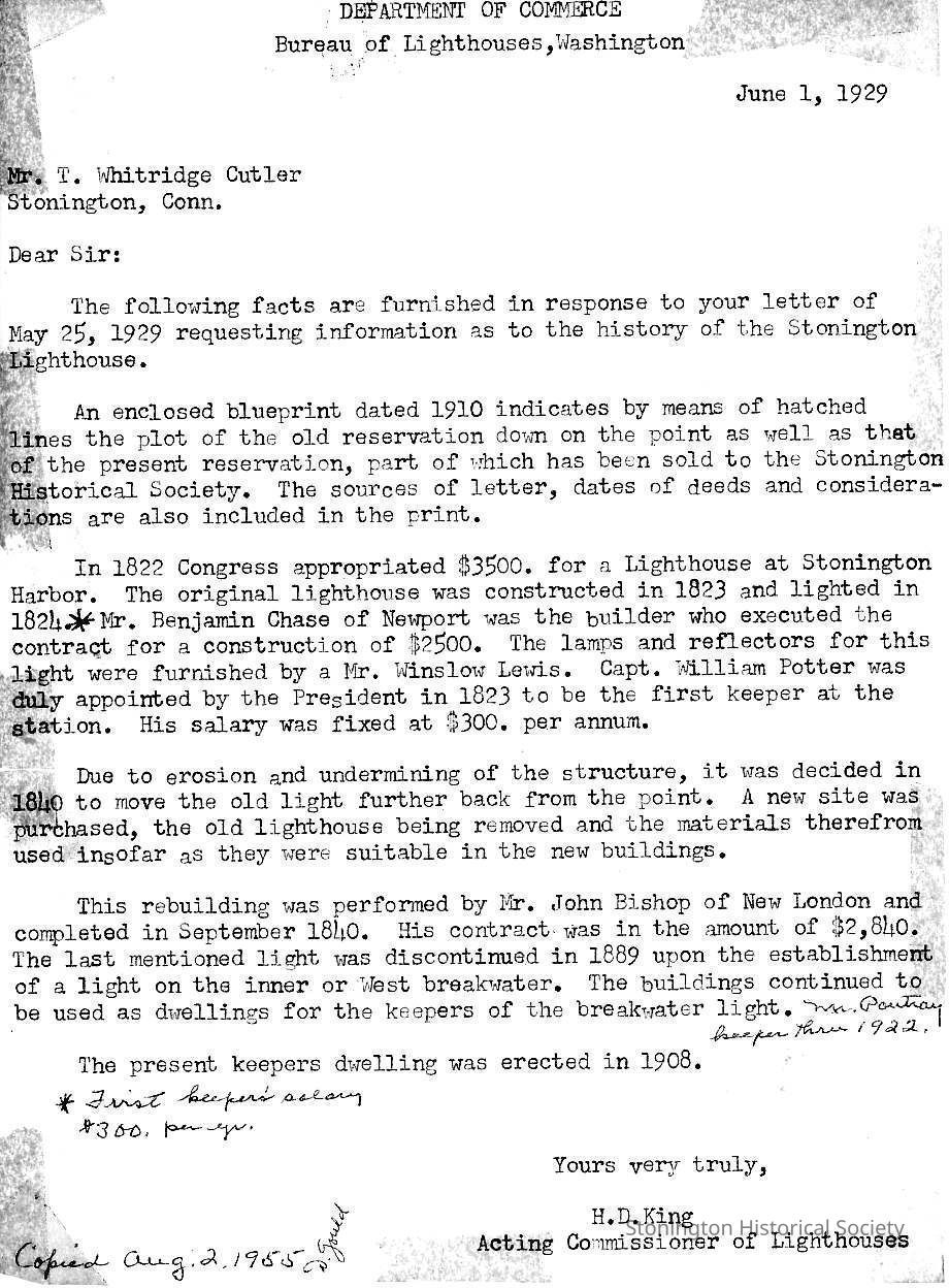 Letter to Mr. T. Whitridge Cutler from H. D. King, Acting Comissioner of Lighthouses, Dept. of Commerce, June 1, 1929 concerning the history of the Stonington Lighthouse. Copied Aug. 2, 1955