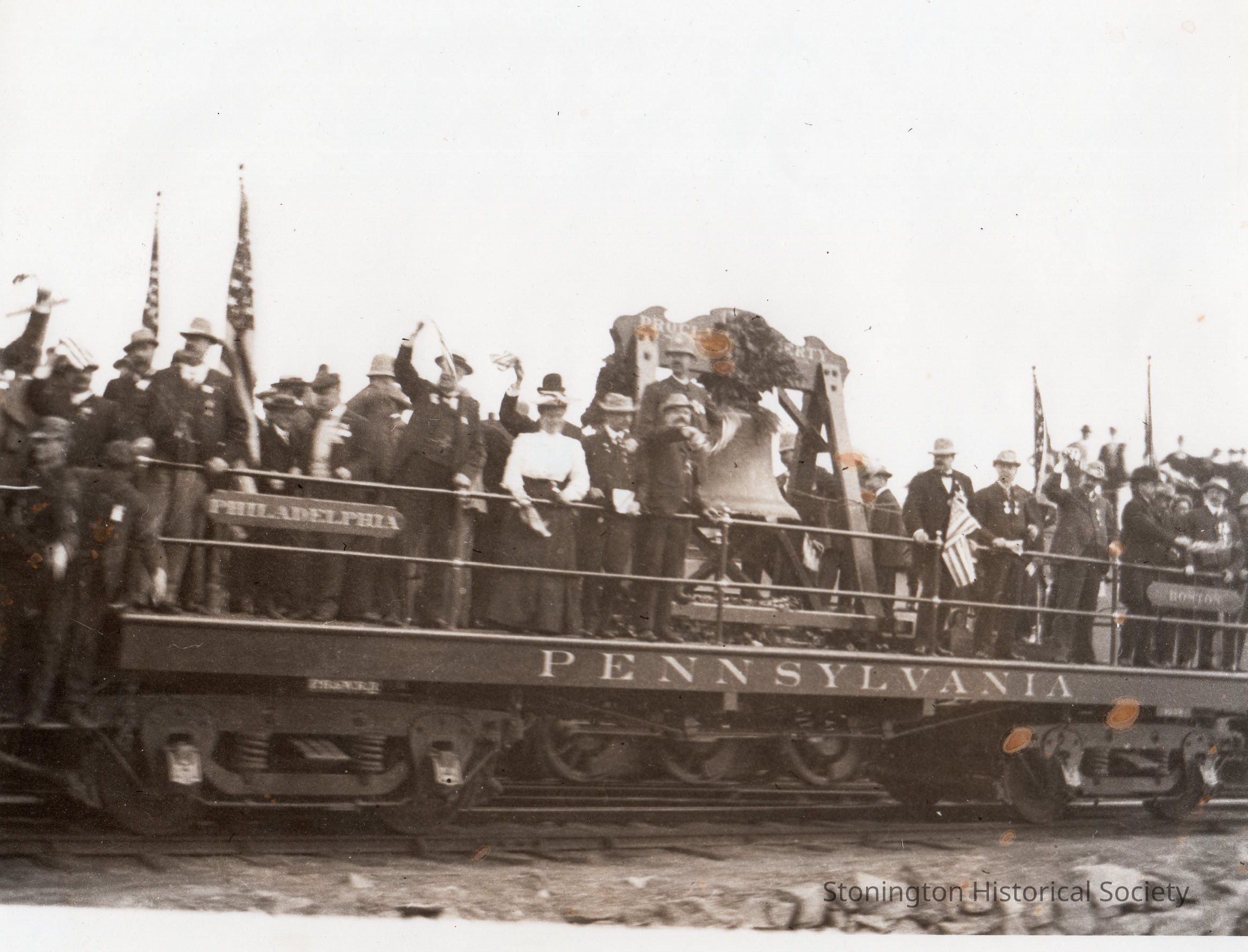 Black and white photo print of the Liberty Bell arriving in Stonington on it's way to Boston for the Battle of Bunker Hill Celebration, June 1903. Copy printed on photo paper.