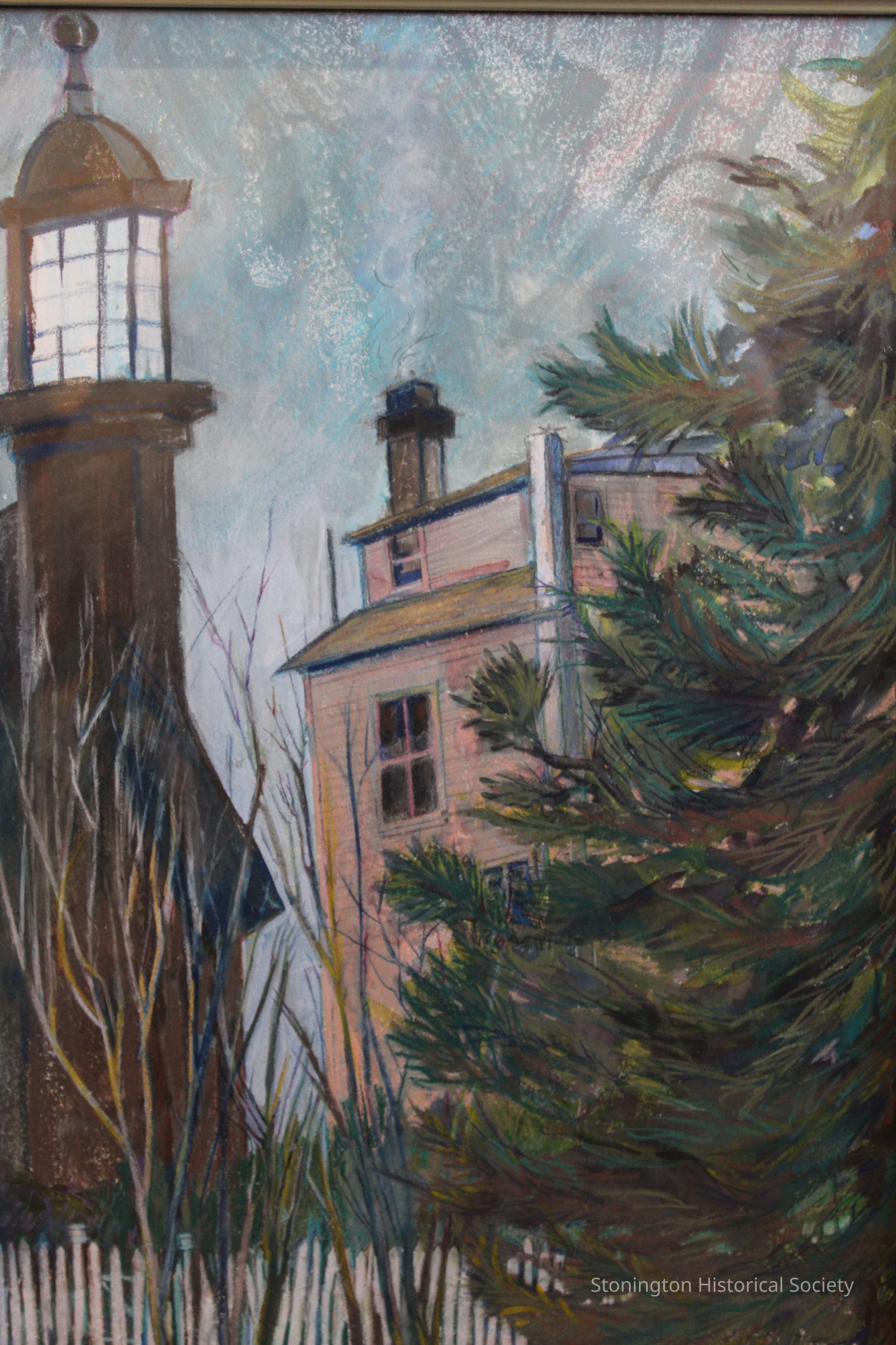 A framed and matted oil pastel drawing of the Stonington Lighthouse with the former keeper's house visible. Dimensions measure approximately 20 x 26". There is no artist information readily available on this piece, but may be discovered if backing is removed. See notes.